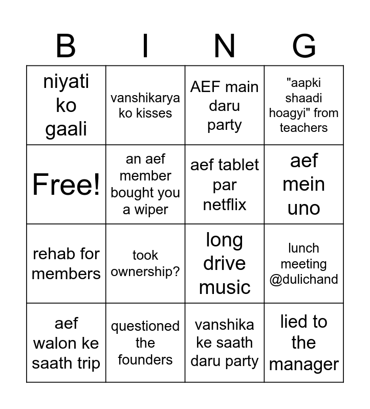 This bingo card has 16 words: questioned the founders, lunch meeting @dulichand, AEF main daru party, niyati ko gaali, rehab for members, vanshikarya ko kisses, long drive music, vanshika ke saath daru party, Free!, an aef member bought you a wiper, aef walon ke saath trip, "aapki shaadi hoagyi" from teachers, took ownership?, aef mein uno, aef tablet par netflix and lied to the manager.
