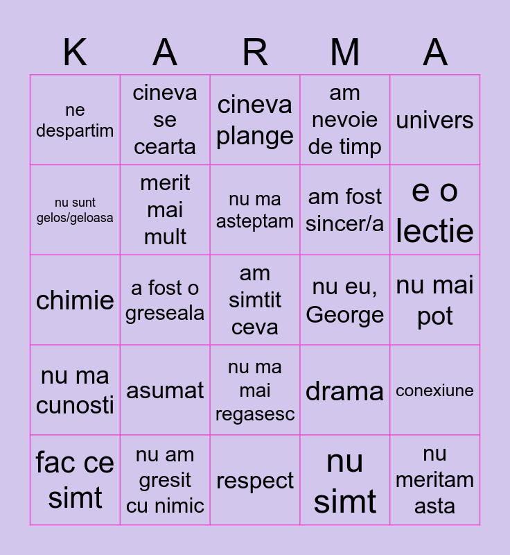 This bingo card has 25 words: asumat, respect, nu ma asteptam, fac ce simt, univers, ne despartim, nu sunt gelos/geloasa, cineva se cearta, nu eu, George, nu ma mai regasesc, am fost sincer/a, chimie, drama, conexiune, merit mai mult, nu meritam asta, nu mai pot, cineva plange, e o lectie, a fost o greseala, am simtit ceva, nu am gresit cu nimic, nu ma cunosti, am nevoie de timp and nu simt.