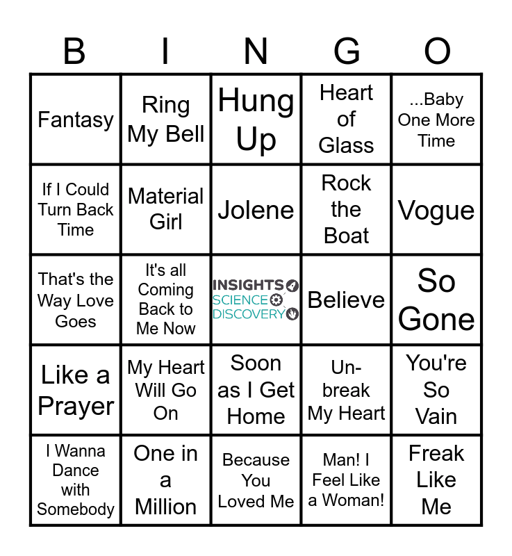 This bingo card has a free space and 29 words: I Wanna Dance with Somebody, Toxic, It's all Coming Back to Me Now, Are You that Somebody, Fantasy, Hung Up, Material Girl, My Heart Will Go On, Believe, One in a Million, So Gone, Freak Like Me, Because You Loved Me, Man! I Feel Like a Woman!, Vogue, I Will Always Love You, Soon as I Get Home, Like a Prayer, ...Baby One More Time, That's the Way Love Goes, Un-break My Heart, We Belong Together, Rock the Boat, If I Could Turn Back Time, Heart of Glass, Ring My Bell, You're So Vain, Jolene and I Will Survive.