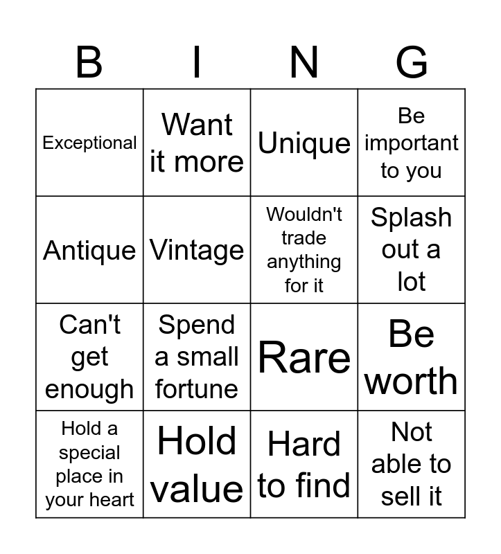 This bingo card has 16 words: Hold value, Be worth, Unique, Exceptional, Can't get enough, Want it more, Rare, Hard to find, Antique, Vintage, Hold a special place in your heart, Be important to you, Spend a small fortune, Splash out a lot, Wouldn't trade anything for it and Not able to sell it.