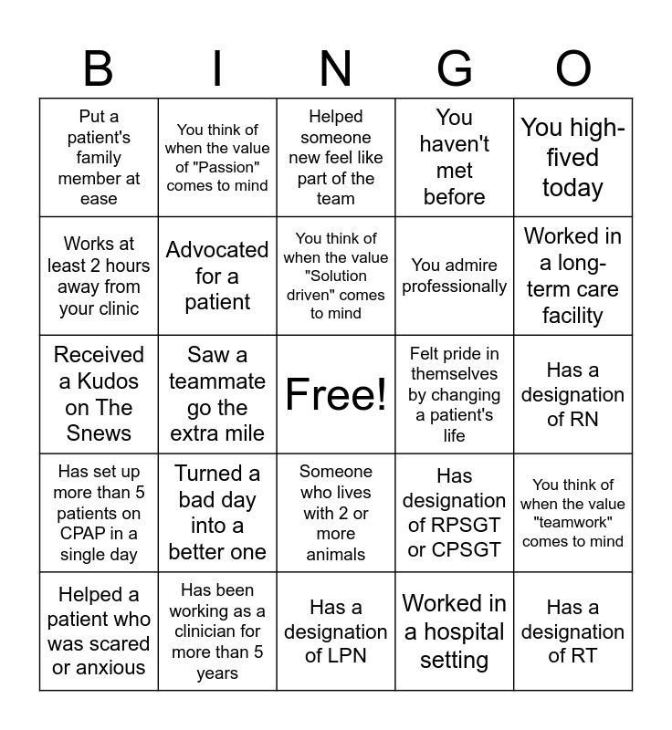 This bingo card has a free space and 29 words: Helped a patient who was scared or anxious, Found a creative way to solve a patient issue, Saw a teammate go the extra mile, Stayed late or started early to help, Put a patient's family member at ease, Helped someone new feel like part of the team, Advocated for a patient, Turned a bad day into a better one, Felt pride in themselves by changing a patient's life, Has been working as a clinician for more than 5 years, Has a designation of RN, Has a designation of RT, Has a designation of LPN, Worked in a hospital setting, Worked in a long-term care facility, Has more than 2 kids, Someone who lives with 2 or more animals, Has set up more than 5 patients on CPAP in a single day, You high-fived today, Received a Kudos on The Snews, Has designation of RPSGT or CPSGT, Uses CPAP themselves, You admire professionally, Works at least 2 hours away from your clinic, You haven't met before, You think of when the value of "Passion" comes to mind, You think of when the value "teamwork" comes to mind, You think of when the value "Solution driven" comes to mind and You think of when the value of "Patient Focused" comes to mind.