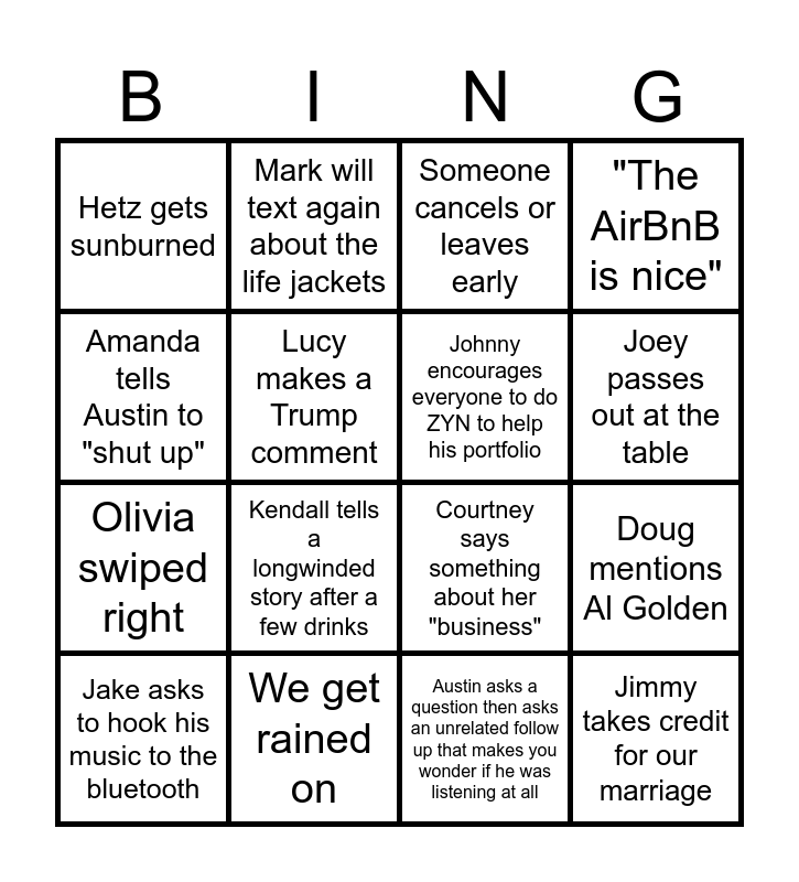 This bingo card has 16 words: We get rained on, Doug mentions Al Golden, Someone cancels or leaves early, Hetz gets sunburned, Olivia swiped right, Mark will text again about the life jackets, Courtney says something about her "business", Austin asks a question then asks an unrelated follow up that makes you wonder if he was listening at all, Amanda tells Austin to "shut up", Lucy makes a Trump comment, Jake asks to hook his music to the bluetooth, "The AirBnB is nice", Kendall tells a longwinded story after a few drinks, Joey passes out at the table, Johnny encourages everyone to do ZYN to help his portfolio and Jimmy takes credit for our marriage.