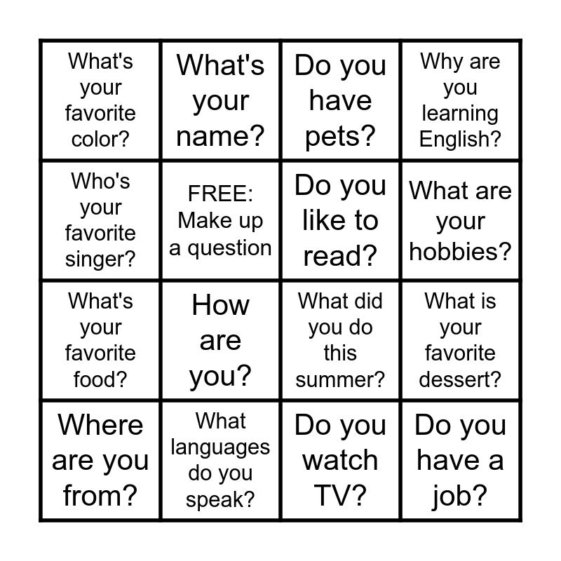 This bingo card has 16 words: What languages do you speak?, What is your favorite dessert?, Do you have pets?, What's your favorite color?, What's your favorite food?, What's your name?, What did you do this summer?, Do you watch TV?, Who's your favorite singer?, FREE: Make up a question, Where are you from?, Why are you learning English?, How are you?, What are your hobbies?, Do you like to read? and Do you have a job?.