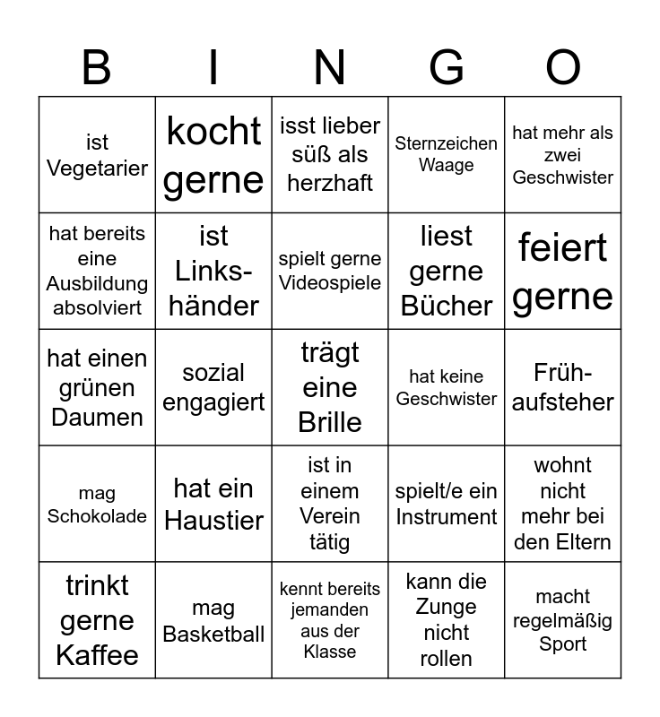 This bingo card has a free space and 24 words: hat ein Haustier, mag Basketball, spielt gerne Videospiele, trinkt gerne Kaffee, hat mehr als zwei Geschwister, ist Vegetarier, hat bereits eine Ausbildung absolviert, kocht gerne, hat keine Geschwister, ist in einem Verein tätig, liest gerne Bücher, hat einen grünen Daumen, spielt/e ein Instrument, wohnt nicht mehr bei den Eltern, ist Links-händer, kann die Zunge nicht rollen, Früh-aufsteher, isst lieber süß als herzhaft, feiert gerne, sozial engagiert, macht regelmäßig Sport, mag Schokolade, Sternzeichen Waage and kennt bereits jemanden aus der Klasse.