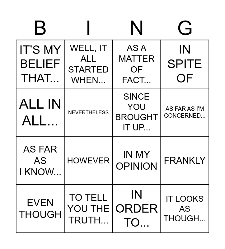 This bingo card has 16 words: TO TELL YOU THE TRUTH..., FRANKLY, AS A MATTER OF FACT..., IT’S MY BELIEF THAT..., AS FAR AS I KNOW..., WELL, IT ALL STARTED WHEN..., IN MY OPINION, IN ORDER TO..., ALL IN ALL..., NEVERTHELESS, EVEN THOUGH, IN SPITE OF, HOWEVER, AS FAR AS I’M CONCERNED..., SINCE YOU BROUGHT IT UP... and IT LOOKS AS THOUGH....
