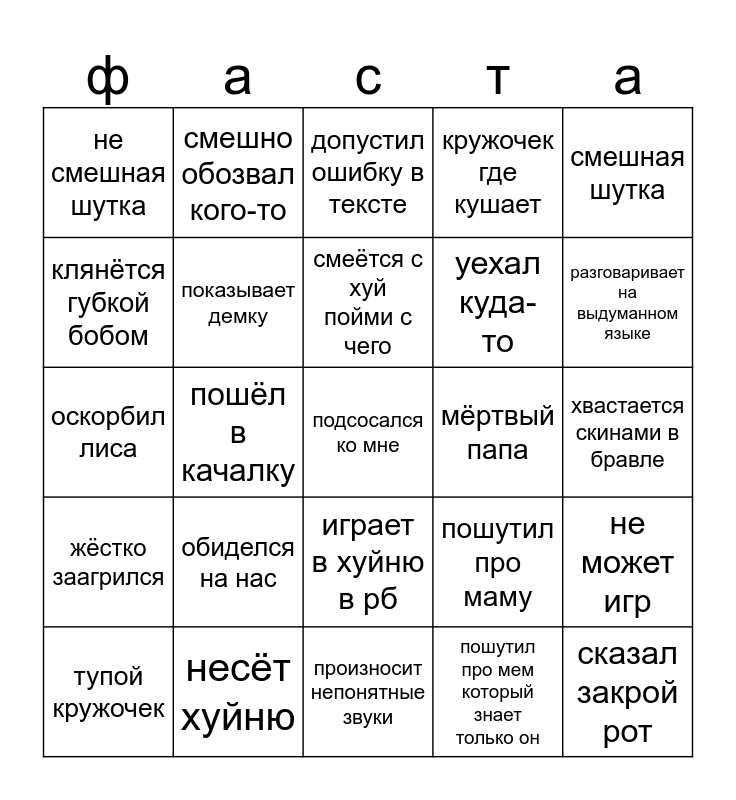 This bingo card has a free space and 24 words: обиделся на нас, несёт хуйню, смеётся с хуй пойми с чего, тупой кружочек, смешная шутка, не смешная шутка, клянётся губкой бобом, смешно обозвал кого-то, мёртвый папа, играет в хуйню в рб, уехал куда-то, оскорбил лиса, пошутил про маму, не может игр, показывает демку, пошутил про мем который знает только он, хвастается скинами в бравле, допустил ошибку в тексте, разговаривает на выдуманном языке, пошёл в качалку, сказал закрой рот, жёстко заагрился, кружочек где кушает and произносит непонятные звуки.