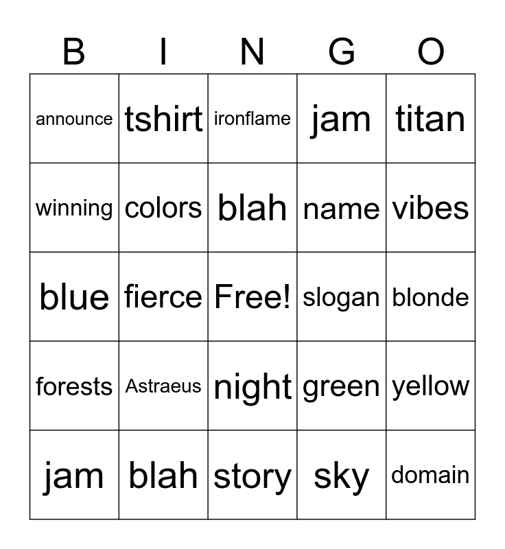 This bingo card has a free space and 24 words: Astraeus, blah, blah, jam, titan, announce, winning, tshirt, slogan, night, name, blue, green, yellow, colors, sky, blonde, ironflame, vibes, fierce, domain, forests, jam and story.