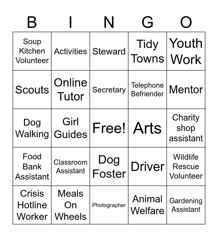 This bingo card has a free space and 33 words: Cat Foster, Board Member, Girl Guides, Befriender, Food Bank Assistant, Online Tutor, Youth Work, Crisis Hotline Worker, Activities, Tutor, Secretary, Steward, Literacy Volunteer, Events, Arts, Mentor, Meals On Wheels, Dog Walking, Classroom Assistant, Driver, Dog Foster, Animal Shelter Volunteer, Soup Kitchen Volunteer, Charity shop assistant, Photographer, Gardening Assistant, Tidy Towns, Telephone Befriender, Scouts, Wildlife Rescue Volunteer, Environmental, Animal Welfare and Litter Pick.