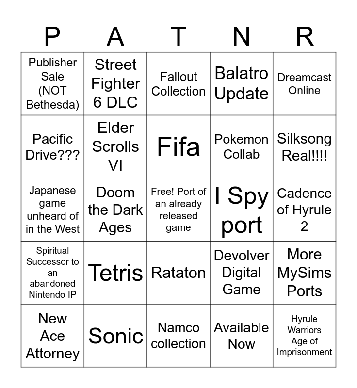 This bingo card has a free space and 31 words: Namco collection, Microsoft wasn't lying, Call of Duty, Doom the Dark Ages, Resident Evil 9, Publisher Sale (NOT Bethesda), Fallout Collection, Elder Scrolls VI, Devolver Digital Game, I Spy port, Available Now, Cadence of Hyrule 2, Hyrule Warriors Age of Imprisonment, A Sony Game??, Kingdom Hearts 4, Silksong Real!!!!, Beyond Good and Evil II, More MySims Ports, Tetris, Spiritual Successor to an abandoned Nintendo IP, Rataton, Dreamcast Online, Professor Layton??, New Ace Attorney, Street Fighter 6 DLC, Pokemon Collab, Pacific Drive???, Balatro Update, Japanese game unheard of in the West, Sonic, Fifa and 2K Sports.