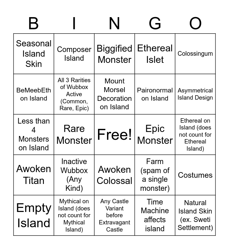 This bingo card has a free space and 29 words: Empty Island, Seasonals on Island, Rare Monster, Rare/Epic Zap Monsters (Adult Celestials, Rare Wublins, etc), Seasonal Island Skin, Biggified Monster, All 3 Rarities of Wubbox Active (Common, Rare, Epic), Inactive Wubbox (Any Kind), Epic Monster, Mythical on Island (does not count for Mythical Island), Ethereal on Island (does not count for Ethereal Island), Natural Island Skin (ex. Sweti Settlement), Any Castle Variant before Extravagant Castle, Time Machine affects island, Asymmetrical Island Design, Symmetrical Island Design, Awoken Colossal, Awoken Titan, Colossingum, Less than 4 Monsters on Island, Farm (spam of a single monster), Mirror Island, Paironormal on Island, BeMeebEth on Island, Ethereal Islet, Composer Island, Costumes, Mount Morsel Decoration on Island and Fire Expansion Monsters on Island.
