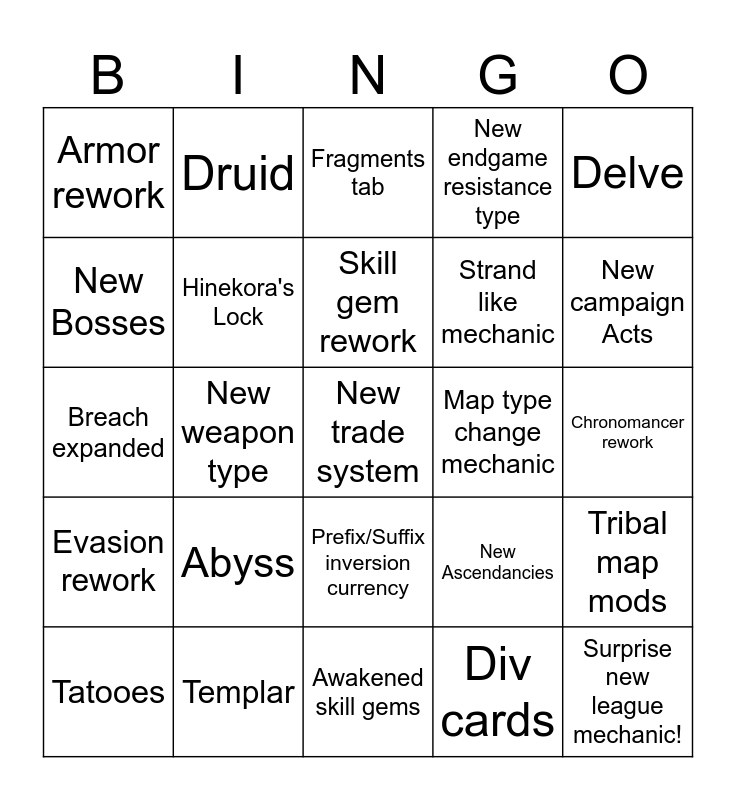 This bingo card has 25 words: Abyss, Awakened skill gems, Skill gem rework, Tatooes, Delve, Armor rework, New Bosses, Druid, Map type change mechanic, Prefix/Suffix inversion currency, Strand like mechanic, Breach expanded, New Ascendancies, Tribal map mods, Hinekora's Lock, Surprise new league mechanic!, Chronomancer rework, Fragments tab, New campaign Acts, New weapon type, New trade system, Templar, Evasion rework, New endgame resistance type and Div cards.