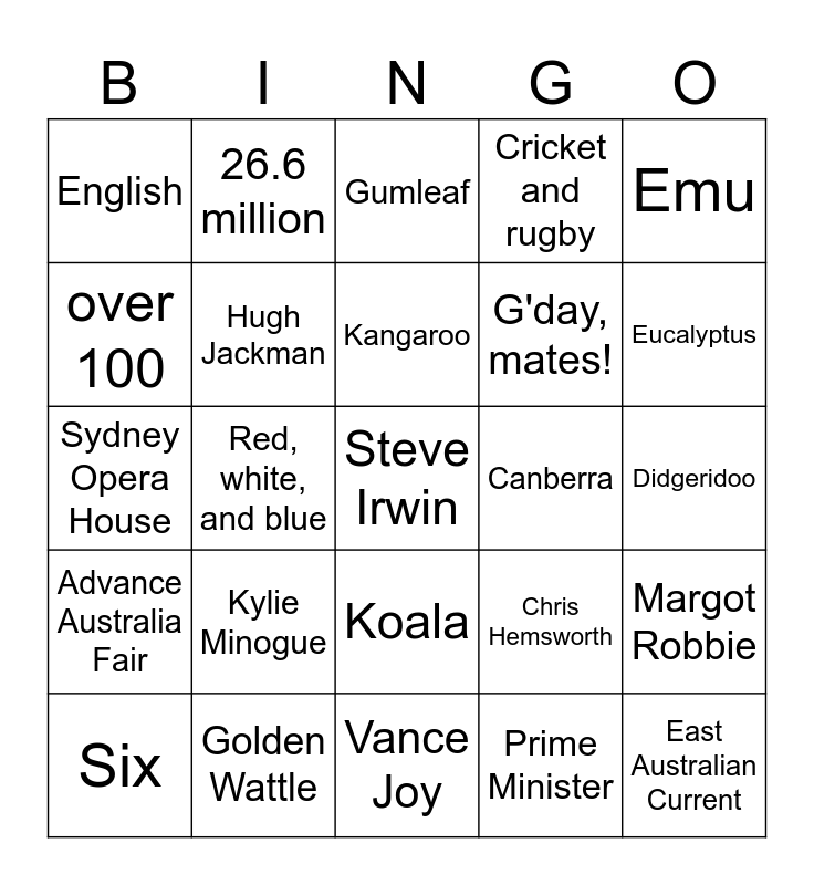 This bingo card has a free space and 24 words: Kylie Minogue, Golden Wattle, Kangaroo, Six, Emu, English, over 100, 26.6 million, Canberra, Koala, G'day, mates!, Sydney Opera House, Chris Hemsworth, Margot Robbie, Hugh Jackman, Prime Minister, Didgeridoo, Gumleaf, Eucalyptus, Red, white, and blue, East Australian Current, Advance Australia Fair, Cricket and rugby and Vance Joy.