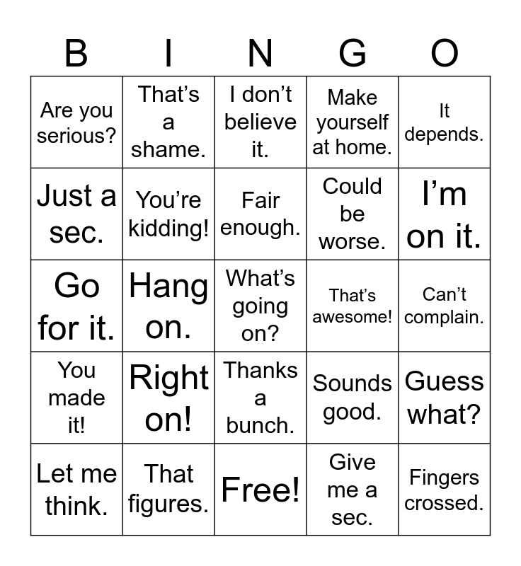 This bingo card has 31 words: Free!, No way!, Hang on., That’s great!, Are you serious?, I don’t believe it., You’re kidding!, Sounds good., That’s awesome!, Give me a sec., Can’t complain., What’s going on?, Fingers crossed., You bet., I’m on it., Don’t worry about it., Guess what?, Right on!, You made it!, Thanks a bunch., It depends., Long time no see!, Let me think., That’s a shame., Could be worse., Just a sec., Make yourself at home., Go for it., That figures., Fair enough. and My bad..