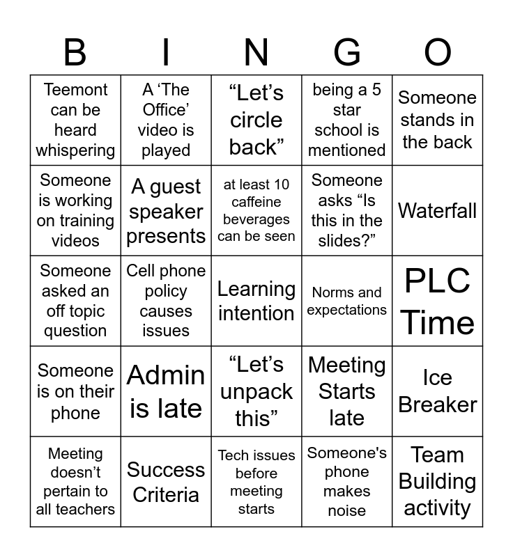 This bingo card has 25 words: Admin is late, Tech issues before meeting starts, at least 10 caffeine beverages can be seen, Meeting doesn’t pertain to all teachers, Someone stands in the back, Teemont can be heard whispering, Someone is working on training videos, A ‘The Office’ video is played, Norms and expectations, “Let’s unpack this”, Someone asks “Is this in the slides?”, Someone asked an off topic question, Meeting Starts late, Ice Breaker, A guest speaker presents, Team Building activity, PLC Time, “Let’s circle back”, Waterfall, Cell phone policy causes issues, Learning intention, Success Criteria, Someone is on their phone, being a 5 star school is mentioned and Someone's phone makes noise.