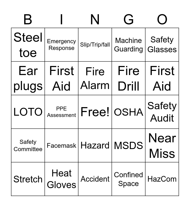 This bingo card has a free space and 24 words: Facemask, Heat Gloves, Fire Alarm, Stretch, Safety Glasses, Steel toe, Ear plugs, Emergency Response, OSHA, Hazard, Fire Drill, LOTO, MSDS, Near Miss, First Aid, Confined Space, Safety Audit, Slip/Trip/fall, First Aid, PPE Assessment, HazCom, Safety Committee, Machine Guarding and Accident.