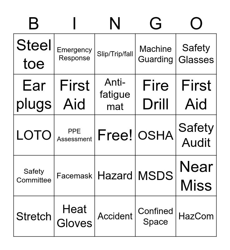 This bingo card has a free space and 24 words: Facemask, Heat Gloves, Anti-fatigue mat, Stretch, Safety Glasses, Steel toe, Ear plugs, Emergency Response, OSHA, Hazard, Fire Drill, LOTO, MSDS, Near Miss, First Aid, Confined Space, Safety Audit, Slip/Trip/fall, First Aid, PPE Assessment, HazCom, Safety Committee, Machine Guarding and Accident.