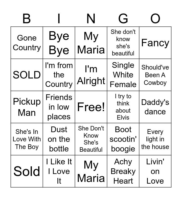 This bingo card has a free space and 49 words: Strawberry Wine, Livin' on Love, Cowboy Take Me Away, My Maria, Dust on the bottle, Watermelon Crawl, Bye Bye, She's in love with the boy, SOLD, Chattahoochee, I'm from the Country, She don't know she's beautiful, Every light in the house, Boot scootin' boogie, Pick up man, If I could make a livin', I'm Alright, I try to think about Elvis, Meet in the middle, Fancy, Friends in low places, Achy Breaky Heart, Gone Country, Single White Female, Meet In The Middle, Should've Been A Cowboy, Sold, Some Girls Do, She Don't Know She's Beautiful, She's In Love With The Boy, Watermelon Crawl, John Deere Green, Maybe It Was Memphis, Strawberry Wine, I Like It I Love It, Check Yes Or No, Wink, Life's a Dance, Daddy's dance, Here's a Quarter, Dust On The Bottle, Independence Day, Small Town Saturday, If I could Make A Living, Pickup Man, My Maria, God Bless Texas, I'm In A Hurry and Brand New Man.