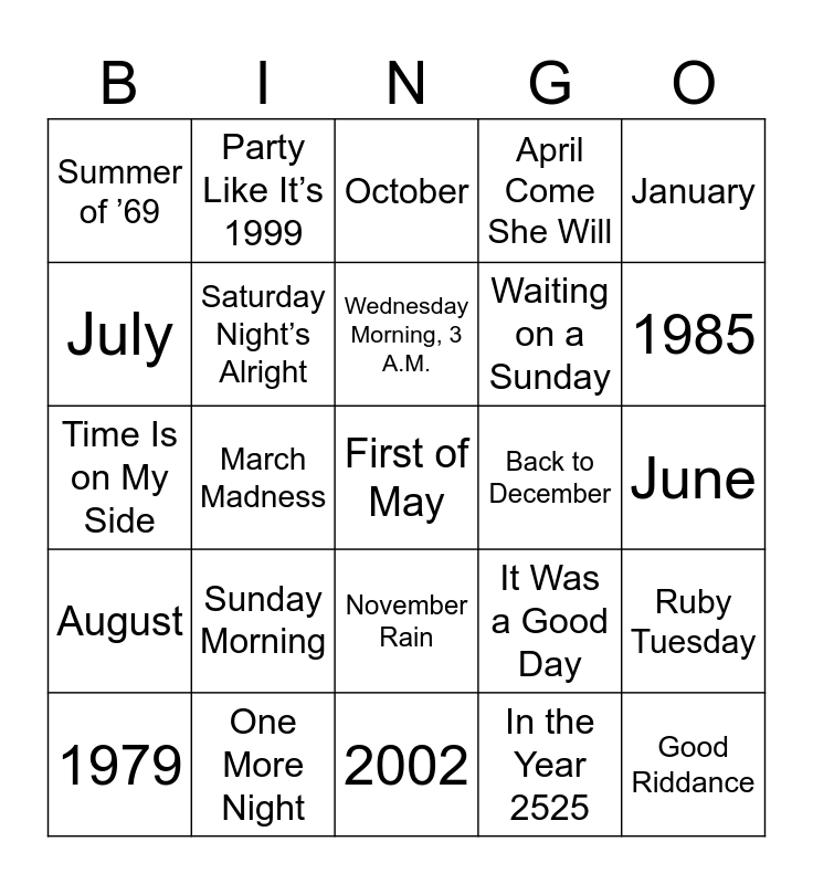 This bingo card has 37 words: Yesterday, Manic Monday, Friday I’m in Love, Saturday Night’s Alright, Ruby Tuesday, Sunday Morning, Wednesday Morning, 3 A.M., Last Friday Night (T.G.I.F.), January, February Air, March Madness, April Come She Will, First of May, June, July, August, September, October, November Rain, Back to December, Summer of ’69, 1985, 1979, 2002, 7 Years, In the Year 2525, Party Like It’s 1999, Midnight City, Time After Time, The Time (Dirty Bit), A Thousand Years, One More Night, Time Is on My Side, Good Riddance, It Was a Good Day, Waiting on a Sunday and 4 Minutes.