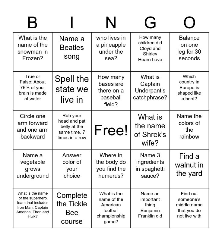 This bingo card has a free space and 24 words: Answer color of your choice, Complete the Tickle Bee course, How many bases are there on a baseball field?, What is the name of the superhero team that includes Iron Man, Captain America, Thor, and Hulk?, Balance on one leg for 30 seconds, What is the name of the snowman in Frozen?, True or False: About 75% of your brain is made of water, Name a Beatles song, What is the name of Shrek’s wife?, Where in the body do you find the humerus?, What is Captain Underpant’s catchphrase?, Circle one arm forward and one arm backward, Name 3 ingredients in spaghetti sauce?, Find a walnut in the yard, Spell the state we live in, Name an important thing Benjamin Franklin did, Name the colors of the rainbow, who lives in a pineapple under the sea?, Which country in Europe is shaped like a boot?, Rub your head and pat belly at the same time, 7 times in a row, Find out someone’s middle name that you do not live with, Name a vegetable grows underground, How many children did Cloyd and Shirley Hearn have and What is the name of the American football championship game?.