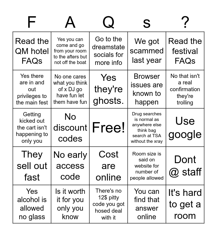 This bingo card has a free space and 24 words: No early access code, Is it worth it for you only you know, Yes they're ghosts., Yes alcohol is allowed no glass, Read the festival FAQs, Read the QM hotel FAQs, Yes there are in and out privileges to the main fest, Yes you can come and go from your room to the afters but not off the boat, Drug searches is normal as anywhere else think bag search at TSA without the xray, Cost are online, Browser issues are known to happen, Getting kicked out the cart isn't happening to only you, Room size is said on website for number of people allowed, Dont @ staff, No one cares what you think of x DJ go have fun let them have fun, You can find that answer online, Use google, Go to the dreamstate socials for more info, No that isn't a real confirmation they're trolling, No discount codes, It's hard to get a room, They sell out fast, We got scammed last year and There's no 12$ pitty code you got hosed deal with it.