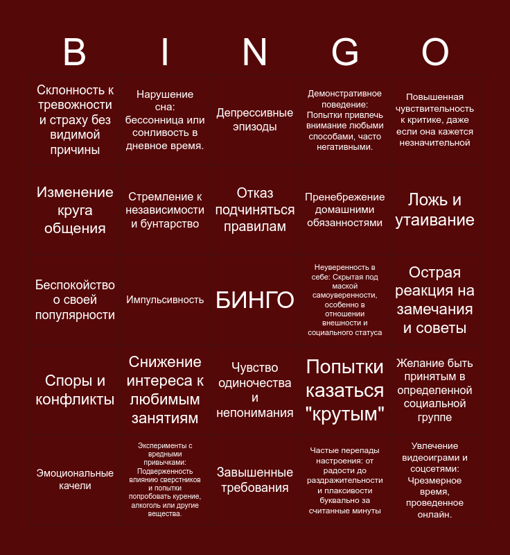 This bingo card has a free space and 24 words: Эмоциональные качели, Снижение интереса к любимым занятиям, Отказ подчиняться правилам, Частые перепады настроения: от радости до раздражительности и плаксивости буквально за считанные минуты, Повышенная чувствительность к критике, даже если она кажется незначительной, Склонность к тревожности и страху без видимой причины, Нарушение сна: бессонница или сонливость в дневное время., Депрессивные эпизоды, Неуверенность в себе: Скрытая под маской самоуверенности, особенно в отношении внешности и социального статуса, Острая реакция на замечания и советы, Беспокойство о своей популярности, Стремление к независимости и бунтарство, Попытки казаться "крутым", Желание быть принятым в определенной социальной группе, Изменение круга общения, Эксперименты с вредными привычками: Подверженность влиянию сверстников и попытки попробовать курение, алкоголь или другие вещества., Завышенные требования, Демонстративное поведение: Попытки привлечь внимание любыми способами, часто негативными., Ложь и утаивание, Споры и конфликты, Импульсивность, Чувство одиночества и непонимания, Пренебрежение домашними обязанностями and Увлечение видеоиграми и соцсетями: Чрезмерное время, проведенное онлайн..