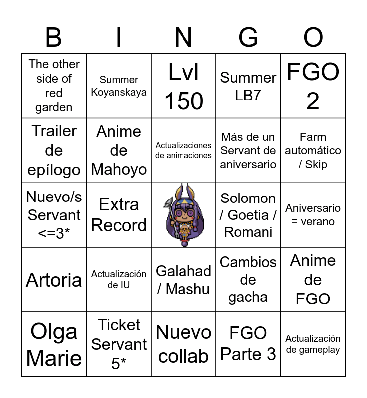 This bingo card has a free space and 24 words: Actualización de IU, Ticket Servant 5*, Actualizaciones de animaciones, Olga Marie, FGO 2, The other side of red garden, Trailer de epílogo, Summer Koyanskaya, Solomon / Goetia / Romani, Galahad / Mashu, Más de un Servant de aniversario, Nuevo/s Servant <=3*, Cambios de gacha, Anime de FGO, Anime de Mahoyo, FGO Parte 3, Aniversario = verano, Lvl 150, Farm automático / Skip, Extra Record, Actualización de gameplay, Artoria, Summer LB7 and Nuevo collab.