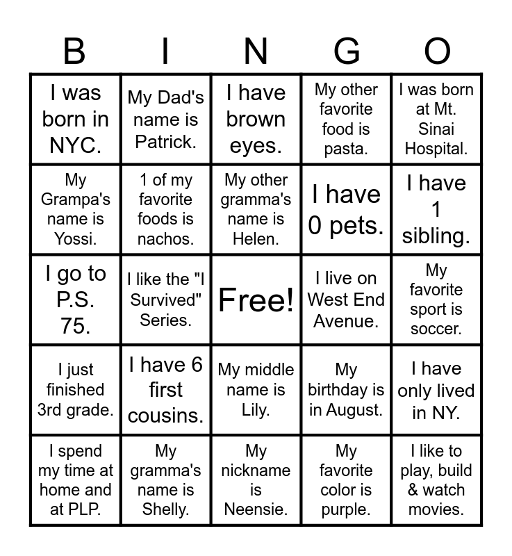 This bingo card has a free space and 24 words: I have 6 first cousins., My gramma's name is Shelly., My other gramma's name is Helen., I spend my time at home and at PLP., I was born at Mt. Sinai Hospital., I was born in NYC., My Grampa's name is Yossi., My Dad's name is Patrick., I live on West End Avenue., My middle name is Lily., I have 0 pets., I go to P.S. 75., My birthday is in August., I have only lived in NY., 1 of my favorite foods is nachos., My favorite color is purple., My favorite sport is soccer., I have brown eyes., I have 1 sibling., I like the "I Survived" Series., I like to play, build & watch movies., I just finished 3rd grade., My other favorite food is pasta. and My nickname is Neensie..