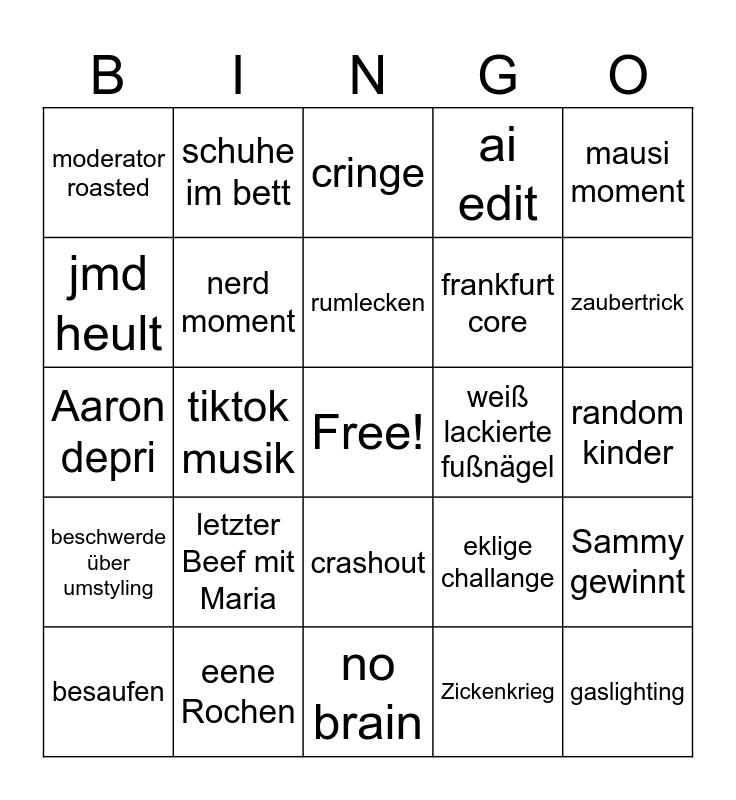 This bingo card has a free space and 24 words: letzter Beef mit Maria, eene Rochen, rumlecken, besaufen, mausi moment, moderator roasted, jmd heult, schuhe im bett, weiß lackierte fußnägel, crashout, frankfurt core, Aaron depri, eklige challange, Sammy gewinnt, nerd moment, Zickenkrieg, random kinder, cringe, zaubertrick, tiktok musik, gaslighting, beschwerde über umstyling, ai edit and no brain.