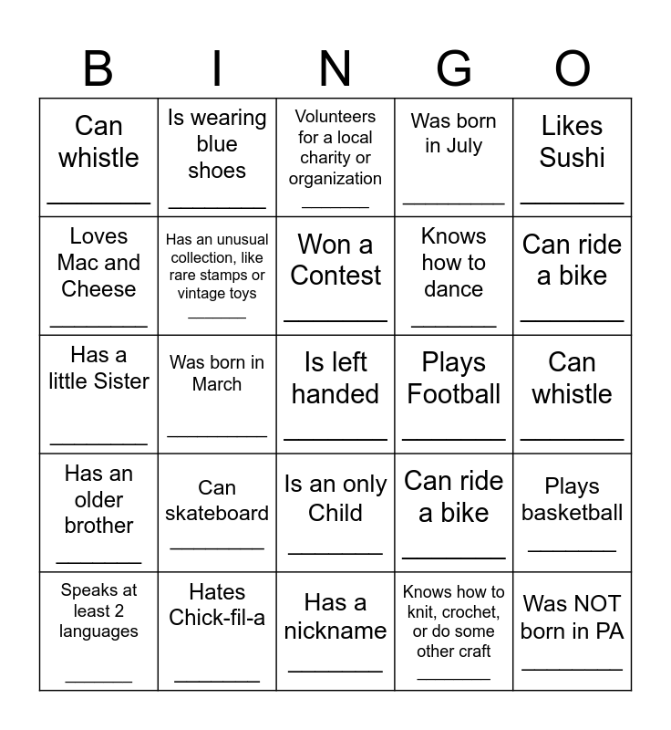 This bingo card has 35 words: Has traveled to more than 3 countries _______, Is wearing jeans ________, Plays the piano _______, Has an unusual collection, like rare stamps or vintage toys _______, Is an only Child _______, Was born in July _________, Loves Mac and Cheese ________, Can juggle _______, Won a Contest _______, Hates Pizza _______, Has a little Sister ________, Likes Sushi _______, Has a grey cat _______, Plays soccer for school ________, Can whistle _______, Plays Football _______, Knows how to knit, crochet, or do some other craft ________, Was born in March __________, Has an older brother _______, Is left handed _______, Can ride a bike _______, Speaks at least 2 languages _______, Plays basketball _______, Hates Chick-fil-a _______, Volunteers for a local charity or organization _______, Can ride a bike _______, Was NOT born in PA ________, Has an Xbox ______, Knows how to dance _______, Can whistle _______, Enjoys Camping _______, Has a nickname _______, Can skateboard ________, Is wearing blue shoes ________ and is 5.5 feet tall _____.