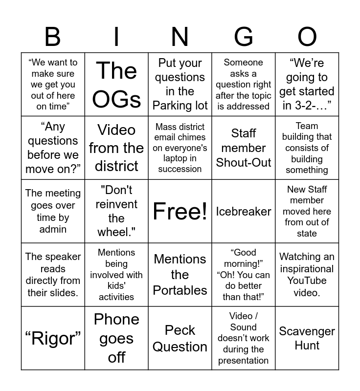 This bingo card has a free space and 43 words: Data Chat, Scavenger Hunt, “What is your why”, “Rigor”, "I'm not going to waste your time”, Video / Sound doesn’t work during the presentation, Put your questions in the Parking lot, “I still remember sitting in an empty field with a vision for Bonita Springs High School”, “We’re going to get started in 3-2-…”, Phone goes off, Someone asks a question right after the topic is addressed, Icebreaker, Mentions the Portables, Mentions being involved with kids' activities, Activity with post-it notes, Peck Question, Luther Comment, The meeting goes over time by admin, School Grade Comment, Team building that consists of building something, The OGs, Someone asks a question that has already been answered, Someone asks a question that only pertains to their situation, “We want to make sure we get you out of here on time”, Arts & Crafts Team Building, New Staff member moved here from out of state, “Talk to your shoulder partner/table”, Admin passes out worksheet for you to fill out, “Good morning!” “Oh! You can do better than that!”, The speaker reads directly from their slides., Kagan Activities, Watching an inspirational YouTube video., Someone shows up 10+ min late, "Don't reinvent the wheel.", The meeting starts late, The location of the meeting is moved, “This is something you could try with your students!”, Mass district email chimes on everyone's laptop in succession, “Any questions before we move on?”, Staff member Shout-Out, "Would anyone like to share what your group talked about?", Video from the district and “Please see the staff website for that answer/document”.