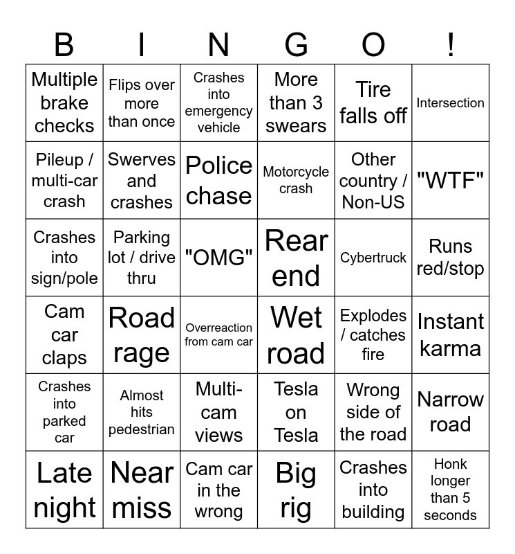 This bingo card has 36 words: Tesla on Tesla, Multi-cam views, Big rig, Pileup / multi-car crash, Cam car claps, Rear end, Swerves and crashes, Cam car in the wrong, Tire falls off, Wrong side of the road, "WTF", More than 3 swears, Narrow road, Parking lot / drive thru, Motorcycle crash, Multiple brake checks, Crashes into parked car, Cybertruck, Crashes into sign/pole, Crashes into emergency vehicle, "OMG", Road rage, Wet road, Overreaction from cam car, Explodes / catches fire, Flips over more than once, Other country / Non-US, Near miss, Police chase, Intersection, Honk longer than 5 seconds, Late night, Instant karma, Runs red/stop, Almost hits pedestrian and Crashes into building.