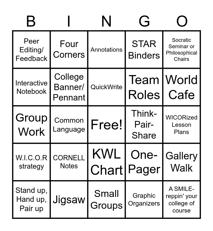 This bingo card has a free space and 24 words: Stand up, Hand up, Pair up, CORNELL Notes, QuickWrite, Graphic Organizers, Socratic Seminar or Philosophical Chairs, Peer Editing/ Feedback, Four Corners, Annotations, Think-Pair-Share, WICORized Lesson Plans, Group Work, College Banner/ Pennant, One-Pager, Gallery Walk, Interactive Notebook, Jigsaw, Small Groups, STAR Binders, World Cafe, W.I.C.O.R strategy, Common Language, KWL Chart, Team Roles and A SMILE-reppin' your college of course.