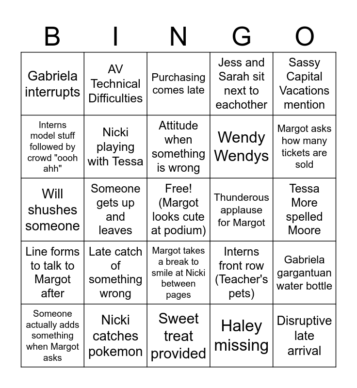 This bingo card has a free space and 24 words: Late catch of something wrong, Nicki catches pokemon, Attitude when something is wrong, Someone actually adds something when Margot asks, Sassy Capital Vacations mention, Gabriela interrupts, Interns model stuff followed by crowd "oooh ahh", AV Technical Difficulties, Thunderous applause for Margot, Margot takes a break to smile at Nicki between pages, Wendy Wendys, Will shushes someone, Interns front row (Teacher's pets), Gabriela gargantuan water bottle, Nicki playing with Tessa, Haley missing, Tessa More spelled Moore, Purchasing comes late, Margot asks how many tickets are sold, Someone gets up and leaves, Disruptive late arrival, Line forms to talk to Margot after, Jess and Sarah sit next to eachother and Sweet treat provided.
