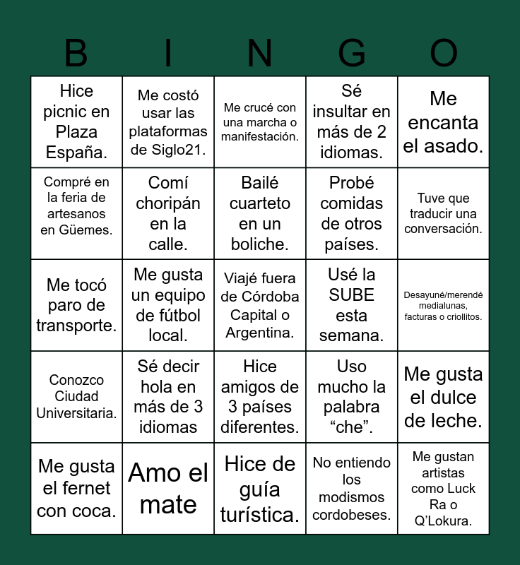 This bingo card has a free space and 24 words: Sé decir hola en más de 3 idiomas, Amo el mate, Bailé cuarteto en un boliche., Me gusta el fernet con coca., Me encanta el asado., Hice picnic en Plaza España., Compré en la feria de artesanos en Güemes., Me costó usar las plataformas de Siglo21., Usé la SUBE esta semana., Hice amigos de 3 países diferentes., Probé comidas de otros países., Me tocó paro de transporte., Uso mucho la palabra “che”., Me gusta el dulce de leche., Comí choripán en la calle., No entiendo los modismos cordobeses., Desayuné/merendé medialunas, facturas o criollitos., Me crucé con una marcha o manifestación., Tuve que traducir una conversación., Me gusta un equipo de fútbol local., Me gustan artistas como Luck Ra o Q’Lokura., Conozco Ciudad Universitaria., Sé insultar en más de 2 idiomas. and Hice de guía turística..