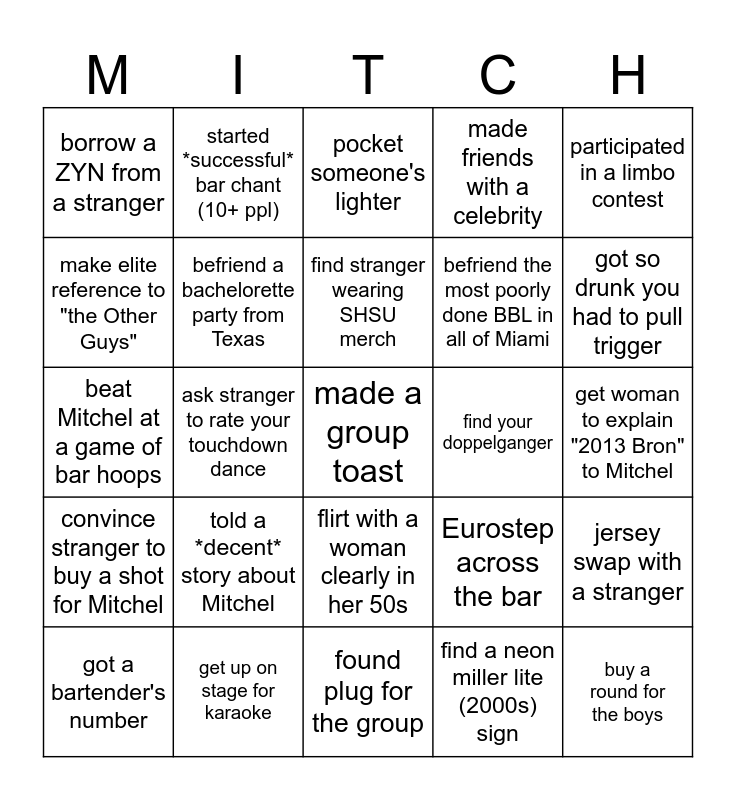 This bingo card has a free space and 24 words: told a *decent* story about Mitchel, get up on stage for karaoke, find stranger wearing SHSU merch, got a bartender's number, participated in a limbo contest, borrow a ZYN from a stranger, make elite reference to "the Other Guys", started *successful* bar chant (10+ ppl), find your doppelganger, flirt with a woman clearly in her 50s, befriend the most poorly done BBL in all of Miami, beat Mitchel at a game of bar hoops, Eurostep across the bar, jersey swap with a stranger, befriend a bachelorette party from Texas, find a neon miller lite (2000s) sign, get woman to explain "2013 Bron" to Mitchel, pocket someone's lighter, got so drunk you had to pull trigger, ask stranger to rate your touchdown dance, buy a round for the boys, convince stranger to buy a shot for Mitchel, made friends with a celebrity and found plug for the group.