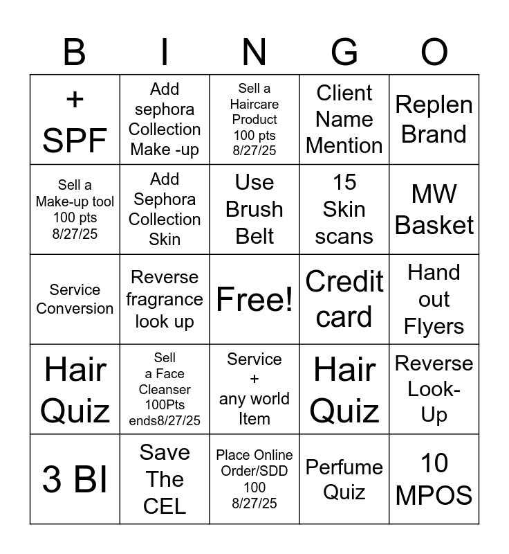 This bingo card has a free space and 24 words: Sell a Face Cleanser 100Pts ends8/27/25, Save The CEL, Use Brush Belt, 3 BI, Replen Brand, + SPF, Sell a Make-up tool 100 pts 8/27/25, Add sephora Collection Make -up, Credit card, Service + any world Item, 15 Skin scans, Service Conversion, Hair Quiz, Reverse Look- Up, Add Sephora Collection Skin, Perfume Quiz, Hand out Flyers, Sell a Haircare Product 100 pts 8/27/25, MW Basket, Reverse fragrance look up, 10 MPOS, Hair Quiz, Client Name Mention and Place Online Order/SDD 100 8/27/25.