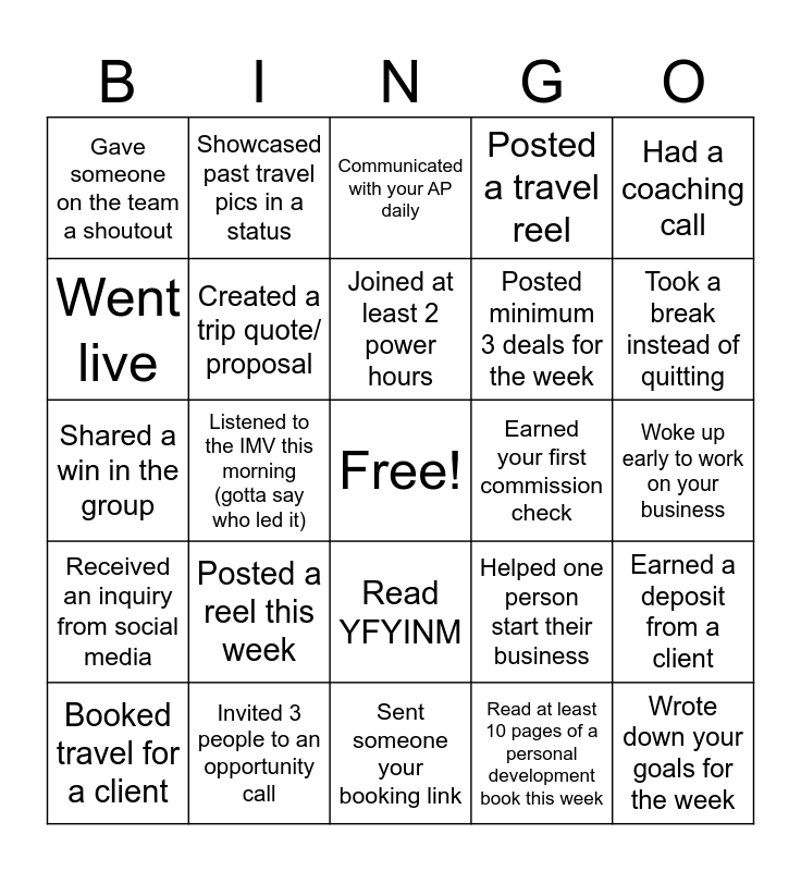 This bingo card has a free space and 24 words: Posted a reel this week, Invited 3 people to an opportunity call, Joined at least 2 power hours, Booked travel for a client, Had a coaching call, Gave someone on the team a shoutout, Went live, Showcased past travel pics in a status, Earned your first commission check, Read YFYINM, Posted minimum 3 deals for the week, Shared a win in the group, Helped one person start their business, Earned a deposit from a client, Created a trip quote/ proposal, Read at least 10 pages of a personal development book this week, Woke up early to work on your business, Communicated with your AP daily, Took a break instead of quitting, Listened to the IMV this morning (gotta say who led it), Wrote down your goals for the week, Received an inquiry from social media, Posted a travel reel and Sent someone your booking link.
