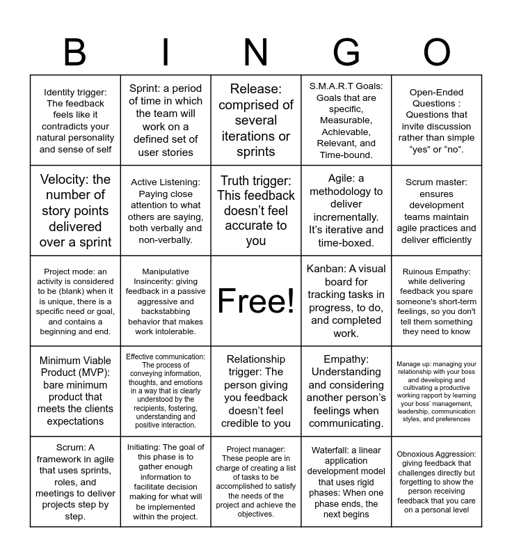 This bingo card has a free space and 28 words: Manage up: managing your relationship with your boss and developing and cultivating a productive working rapport by learning your boss’ management, leadership, communication styles, and preferences, Persona: a detailed summary of your ideal customer including location, age, behaviors, needs, and challenges, Agile: a methodology to deliver incrementally. It’s iterative and time-boxed., Waterfall: a linear application development model that uses rigid phases: When one phase ends, the next begins, Velocity: the number of story points delivered over a sprint, Release: comprised of several iterations or sprints, Sprint: a period of time in which the team will work on a defined set of user stories, Minimum Viable Product (MVP): bare minimum product that meets the clients expectations, Kanban: A visual board for tracking tasks in progress, to do, and completed work., Scrum: A framework in agile that uses sprints, roles, and meetings to deliver projects step by step., Project mode: an activity is considered to be (blank) when it is unique, there is a specific need or goal, and contains a beginning and end., S.M.A.R.T Goals: Goals that are specific, Measurable, Achievable, Relevant, and Time-bound., Initiating: The goal of this phase is to gather enough information to facilitate decision making for what will be implemented within the project., Project manager: These people are in charge of creating a list of tasks to be accomplished to satisfy the needs of the project and achieve the objectives., Scrum master: ensures development teams maintain agile practices and deliver efficiently, Feedback: Serve as a tool to offer improvement to the recipient or situation., Effective communication: The process of conveying information, thoughts, and emotions in a way that is clearly understood by the recipients, fostering, understanding and positive interaction., Active Listening: Paying close attention to what others are saying, both verbally and non-verbally., Truth trigger: This feedback doesn’t feel accurate to you, Relationship trigger: The person giving you feedback doesn’t feel credible to you, Identity trigger: The feedback feels like it contradicts your natural personality and sense of self, Radical candor: guidance and feedback that’s both kind and clear, specific and sincere, Obnoxious Aggression: giving feedback that challenges directly but forgetting to show the person receiving feedback that you care on a personal level, Manipulative Insincerity: giving feedback in a passive aggressive and backstabbing behavior that makes work intolerable., Ruinous Empathy: while delivering feedback you spare someone's short-term feelings, so you don't tell them something they need to know, Empathy: Understanding and considering another person’s feelings when communicating., Open-Ended Questions : Questions that invite discussion rather than simple “yes” or “no”. and Mentorship: A long-term relationship where an experienced person supports someone’s growth..