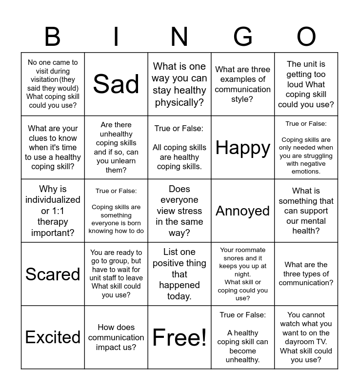 This bingo card has 25 words: Scared, How does communication impact us?, Does everyone view stress in the same way?, True or False: A healthy coping skill can become unhealthy., The unit is getting too loud What coping skill could you use?, No one came to visit during visitation (they said they would) What coping skill could you use?, Sad, What is one way you can stay healthy physically?, Annoyed, What are the three types of communication?, What are your clues to know when it's time to use a healthy coping skill?, Are there unhealthy coping skills and if so, can you unlearn them?, Free!, Your roommate snores and it keeps you up at night. What skill or coping could you use?, True or False: Coping skills are only needed when you are struggling with negative emotions., Excited, True or False: Coping skills are something everyone is born knowing how to do, True or False: All coping skills are healthy coping skills., Happy, What is something that can support our mental health?, Why is individualized or 1:1 therapy important?, You are ready to go to group, but have to wait for unit staff to leave What skill could you use?, List one positive thing that happened today., What are three examples of communication style? and You cannot watch what you want to on the dayroom TV. What skill could you use?.