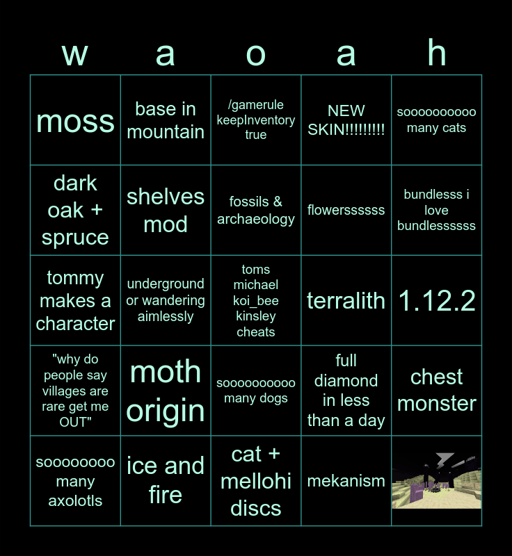 This bingo card has 1 images, a free space and 23 words: moth origin, ice and fire, fossils & archaeology, soooooooo many axolotls, soooooooooo many cats, moss, dark oak + spruce, base in mountain, terralith, soooooooooo many dogs, flowerssssss, tommy makes a character, full diamond in less than a day, chest monster, shelves mod, mekanism, 1.12.2, /gamerule keepInventory true, bundlesss i love bundlessssss, underground or wandering aimlessly, "why do people say villages are rare get me OUT", NEW SKIN!!!!!!!!! and cat + mellohi discs.