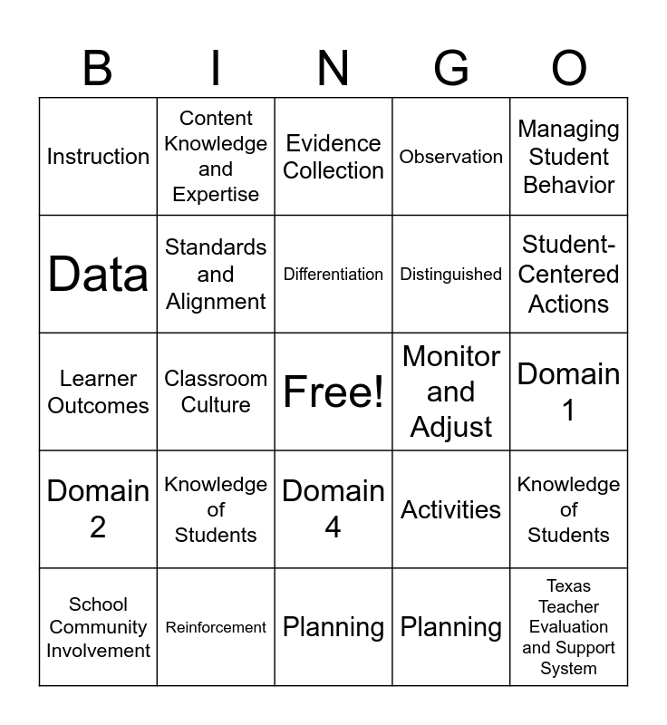 This bingo card has a free space and 52 words: T-TESS, Texas Teacher Evaluation and Support System, Instructional, Planning, Knowledge of Students, Student Learning, Content Knowledge and Expertise, Learning Environment, Data, Professional Practices and Responsibilities, Standards and Alignment, Data and Assessment, Knowledge of Students, Activities, Achieving Expectations, Communication, Differentiation, Monitor and Adjust, Classroom Environment, Routines, and Procedures, Managing Student Behavior, Classroom Culture, Planning, Instruction, Distinguished, Accomplished, Proficient, Developing, Improvement Needed, Student-Centered Actions, Teacher-Centered Actions, Pre-Conference, Observation, Post-Conference, Announced, Unannounced, Evidence Collection, Reinforcement, Refinement, Review Ratings, Self-Analysis, Recommendations, Domain 1, Domain 2, Domain 3, Domain 4, Rubric Overview, Performance Levels, Learner Outcomes, Teacher Behaviors, Student Behaviors, School Community Involvement and Feedback Sharing.