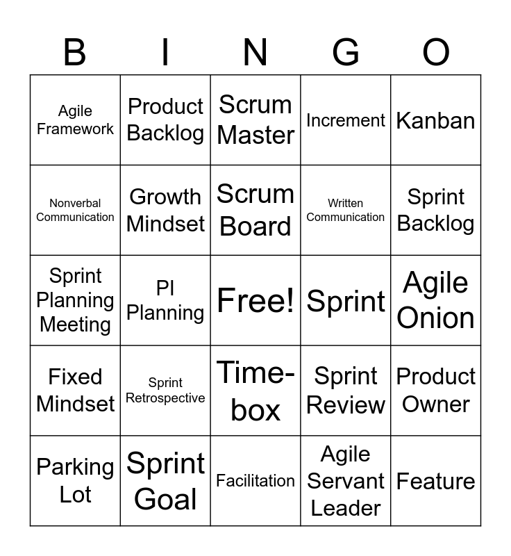 This bingo card has a free space and 34 words: Agile Mindset, Agile Servant Leader, Cross-functional Team, Daily Scrum, Fixed Mindset, Growth Mindset, Kanban, Parking Lot, Product Backlog, Scrum, Scrum Board, Scrum Master, Scrum Team, Self-managing Teams, Sprint, Sprint Backlog, Sprint Goal, Sprint Planning Meeting, Sprint Retrospective, Sprint Review, Time-box, Work In Progress Limit, Agile Framework, Agile Onion, Facilitation, Feature, Increment, Kanban Board, Written Communication, Nonverbal Communication, Verbal Communication, PI Planning, Product Owner and Retrospective.