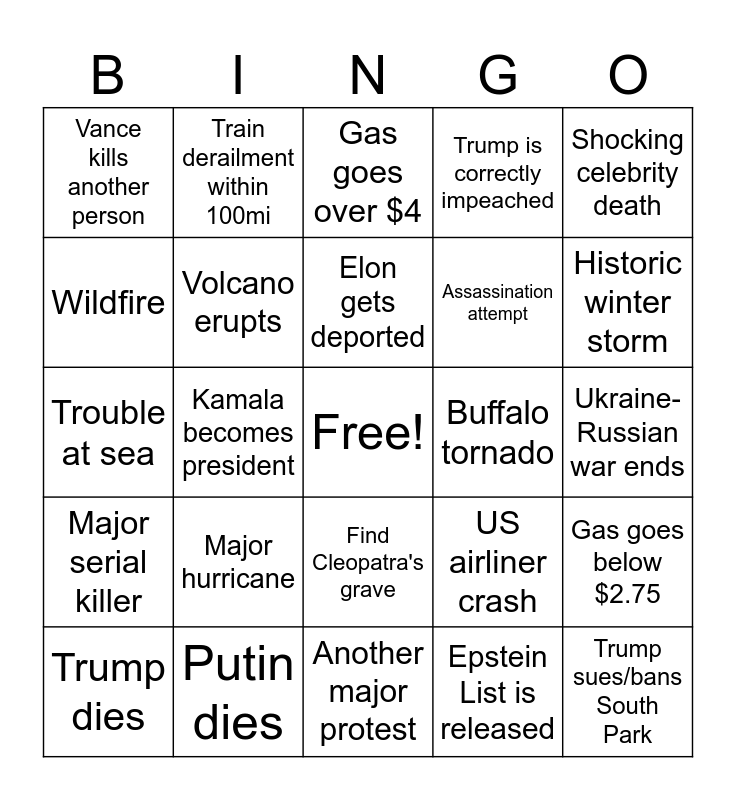 This bingo card has a free space and 29 words: Trump dies, Obama goes to prison, Kamala becomes president, We go to war, Vance kills another person, Gas goes over $4, Volcano erupts, Major hurricane, Buffalo tornado, Putin dies, Ukraine-Russian war ends, Trump sues/bans South Park, Another major protest, Epstein List is released, Historic winter storm, Astroid almost hits Earth, Find Cleopatra's grave, Major serial killer, Shocking celebrity death, Trouble at sea, US airliner crash, Terrorist attack, Assassination attempt, Wildfire, Trump is correctly impeached, Train derailment within 100mi, Gas goes below $2.75, Elon gets deported and Tesla files for bankruptcy.