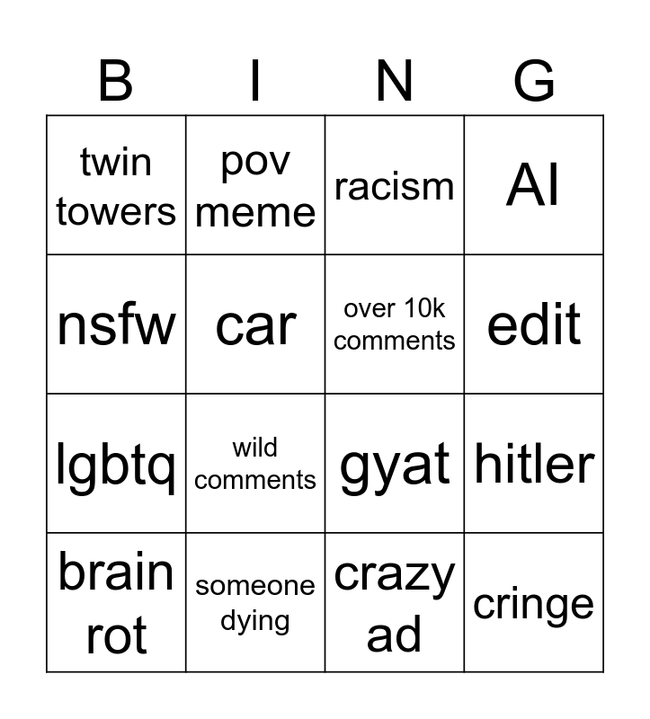 This bingo card has 16 words: someone dying, hitler, racism, twin towers, lgbtq, pov meme, gyat, crazy ad, nsfw, car, brain rot, AI, wild comments, edit, over 10k comments and cringe.
