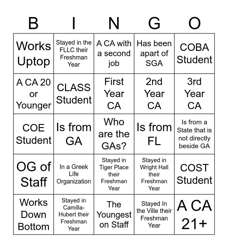 This bingo card has a free space and 24 words: In a Greek Life Organization, Stayed in Camilla-Hubert their Freshman Year, First Year CA, Works Down Bottom, COBA Student, Works Uptop, A CA 20 or Younger, Stayed in the FLLC their Freshman Year, Is from FL, Stayed in Tiger Place their Freshman Year, 2nd Year CA, COE Student, Stayed in Wright Hall their Freshman Year, COST Student, CLASS Student, Stayed In the Ville their Freshman Year, Is from a State that is not directly beside GA, A CA with a second job, 3rd Year CA, Is from GA, A CA 21+, OG of Staff, Has been apart of SGA and The Youngest on Staff.