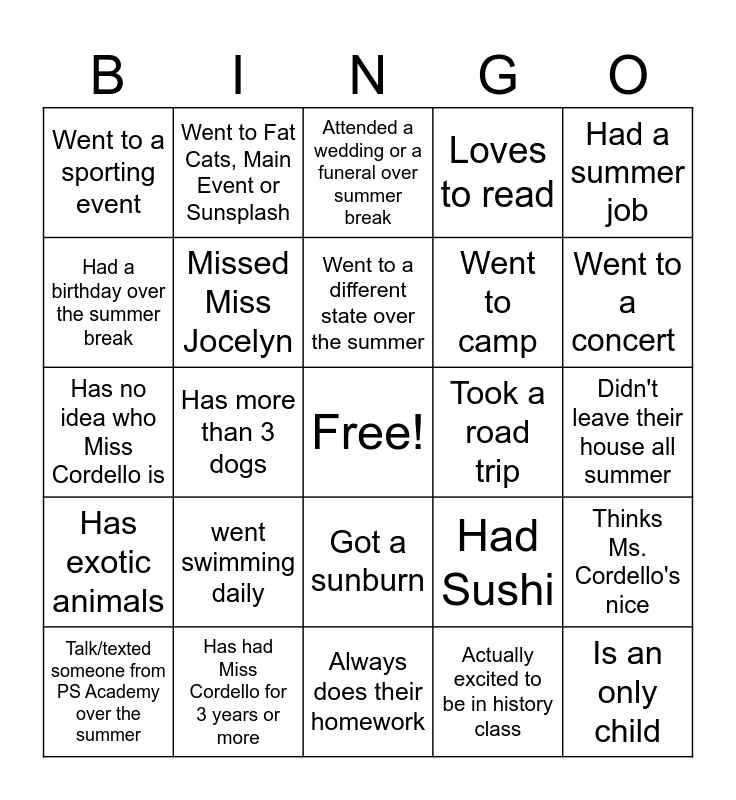This bingo card has a free space and 24 words: went swimming daily, Has had Miss Cordello for 3 years or more, Went to a different state over the summer, Talk/texted someone from PS Academy over the summer, Had a summer job, Went to a sporting event, Had a birthday over the summer break, Went to Fat Cats, Main Event or Sunsplash, Took a road trip, Got a sunburn, Went to camp, Has no idea who Miss Cordello is, Had Sushi, Thinks Ms. Cordello's nice, Missed Miss Jocelyn, Actually excited to be in history class, Didn't leave their house all summer, Attended a wedding or a funeral over summer break, Went to a concert, Has more than 3 dogs, Is an only child, Has exotic animals, Loves to read and Always does their homework.