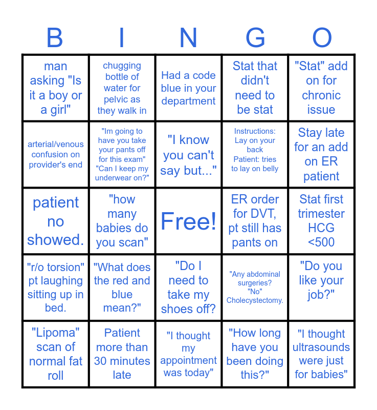 This bingo card has a free space and 24 words: "What does the red and blue mean?", Patient more than 30 minutes late, "I know you can't say but...", "Lipoma" scan of normal fat roll, "Stat" add on for chronic issue, man asking "Is it a boy or a girl", arterial/venous confusion on provider's end, chugging bottle of water for pelvic as they walk in, ER order for DVT, pt still has pants on, "Do I need to take my shoes off?, Instructions: Lay on your back Patient: tries to lay on belly, patient no showed., "Any abdominal surgeries? "No" Cholecystectomy., "Do you like your job?", "Im going to have you take your pants off for this exam" "Can I keep my underwear on?", "How long have you been doing this?", Stat first trimester HCG <500, Had a code blue in your department, Stay late for an add on ER patient, "how many babies do you scan", "I thought ultrasounds were just for babies", "r/o torsion" pt laughing sitting up in bed., Stat that didn't need to be stat and "I thought my appointment was today".