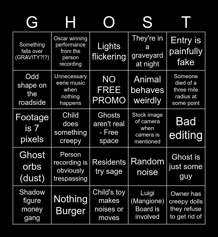 This bingo card has a free space and 24 words: Person recording is obviously trespassing, Nothing Burger, NO FREE PROMO, Shadow figure money gang, Entry is painfully fake, Something falls over (GRAVITY?!?), Odd shape on the roadside, Oscar winning performance from the person recording, Stock image of camera when camera is mentioned, Residents try sage, Animal behaves weirdly, Footage is 7 pixels, Random noise, Ghost is just some guy, Unnecessary eerie music when nothing happens, Luigi (Mangione) Board is involved, Bad editing, Lights flickering, Someone died of a three mile radius at some point, Child does something creepy, Owner has creepy dolls they refuse to get rid of, Ghost orbs (dust), They're in a graveyard at night and Child's toy makes noises or moves.