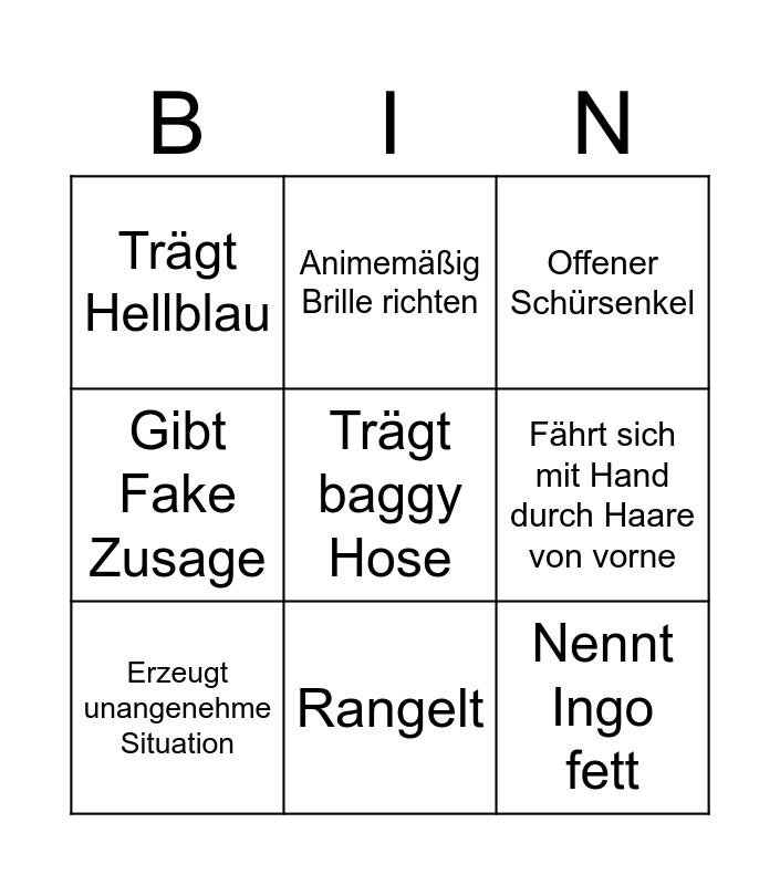 This bingo card has a free space and 8 words: Fährt sich mit Hand durch Haare von vorne, Offener Schürsenkel, Animemäßig Brille richten, Erzeugt unangenehme Situation, Trägt Hellblau, Nennt Ingo fett, Gibt Fake Zusage and Rangelt.
