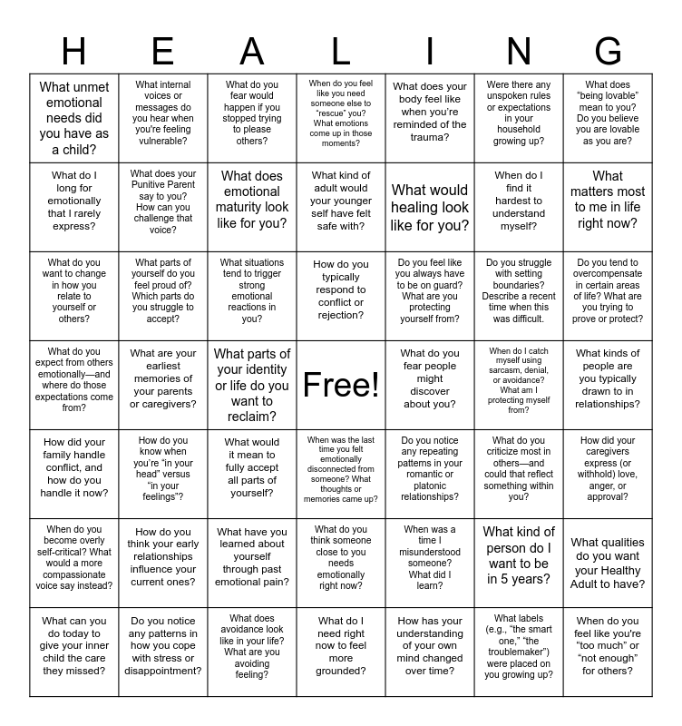This bingo card has a free space and 48 words: When was a time I misunderstood someone? What did I learn?, When do I find it hardest to understand myself?, What do I need right now to feel more grounded?, What are your earliest memories of your parents or caregivers?, What situations tend to trigger strong emotional reactions in you?, What kinds of people are you typically drawn to in relationships?, What internal voices or messages do you hear when you're feeling vulnerable?, Do you notice any patterns in how you cope with stress or disappointment?, Were there any unspoken rules or expectations in your household growing up?, When was the last time you felt emotionally disconnected from someone? What thoughts or memories came up?, What does “being lovable” mean to you? Do you believe you are lovable as you are?, When do you feel like you need someone else to “rescue” you? What emotions come up in those moments?, Do you struggle with setting boundaries? Describe a recent time when this was difficult., Do you feel like you always have to be on guard? What are you protecting yourself from?, When do you become overly self-critical? What would a more compassionate voice say instead?, When do I catch myself using sarcasm, denial, or avoidance? What am I protecting myself from?, What do I long for emotionally that I rarely express?, What matters most to me in life right now?, What kind of person do I want to be in 5 years?, What does your body feel like when you’re reminded of the trauma?, What would healing look like for you?, What parts of your identity or life do you want to reclaim?, What unmet emotional needs did you have as a child?, What does your Punitive Parent say to you? How can you challenge that voice?, What qualities do you want your Healthy Adult to have?, What does emotional maturity look like for you?, Do you tend to overcompensate in certain areas of life? What are you trying to prove or protect?, What can you do today to give your inner child the care they missed?, How do you typically respond to conflict or rejection?, What parts of yourself do you feel proud of? Which parts do you struggle to accept?, What labels (e.g., “the smart one,” “the troublemaker”) were placed on you growing up?, What do you fear people might discover about you?, How did your caregivers express (or withhold) love, anger, or approval?, How do you think your early relationships influence your current ones?, What do you expect from others emotionally—and where do those expectations come from?, Do you notice any repeating patterns in your romantic or platonic relationships?, What do you criticize most in others—and could that reflect something within you?, What do you want to change in how you relate to yourself or others?, What would it mean to fully accept all parts of yourself?, What have you learned about yourself through past emotional pain?, How did your family handle conflict, and how do you handle it now?, When do you feel like you're “too much” or “not enough” for others?, What do you fear would happen if you stopped trying to please others?, What does avoidance look like in your life? What are you avoiding feeling?, What kind of adult would your younger self have felt safe with?, What do you think someone close to you needs emotionally right now?, How do you know when you’re “in your head” versus “in your feelings”? and How has your understanding of your own mind changed over time?.